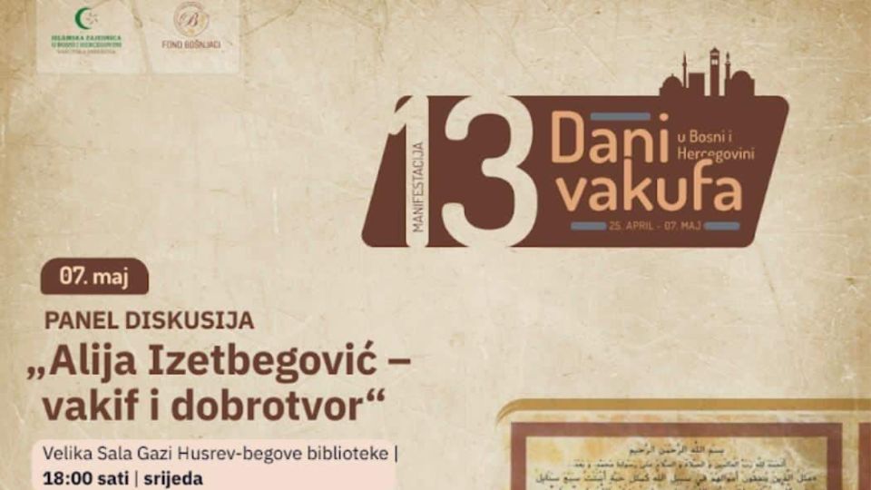 U okviru manifestacije "Dani vakufa 2025", u srijedu, 7. maja, u Velikoj sali Gazi Husrev-begove biblioteke u Sarajevu, večeras će biti održana panel-diskusija pod nazivom "Alija Izetbegović – vakif i dobrotvor".